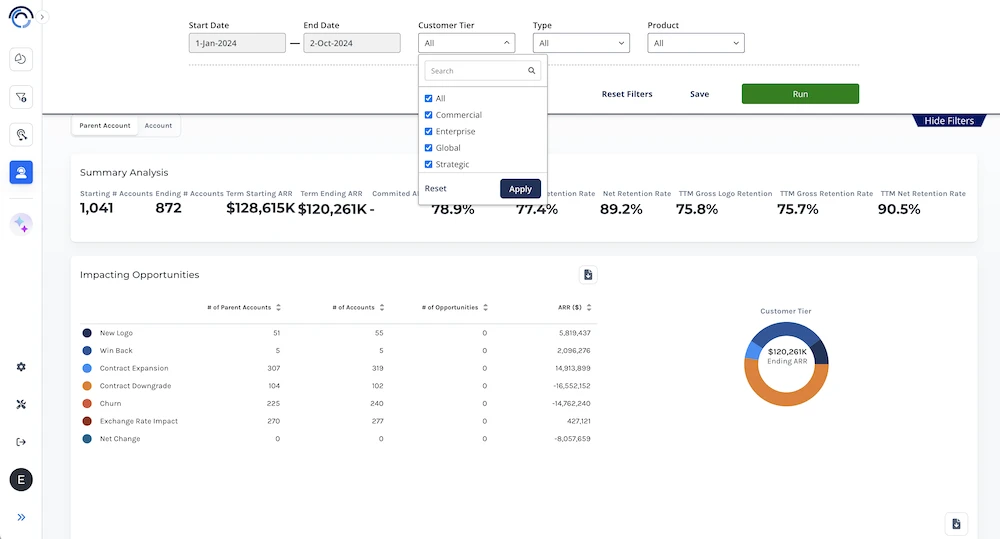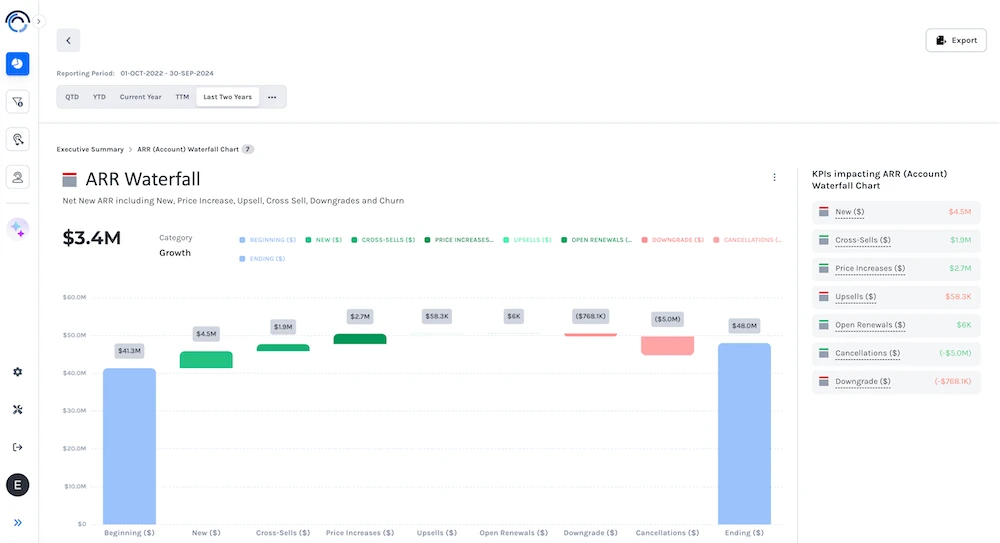 Accurate, consistent ARR calculations help improve investor and stakeholder confidence in a SaaS company’s financial position and growth trajectory. Easily export data in investor favored formats like the Customer Cube.