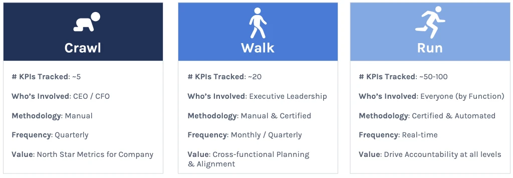 To reach maturity, organizations must map out a clear strategy—aligning board-level and operational goals with key metrics. Over time, automating KPI tracking across the company brings faster decision-making and greater accountability.