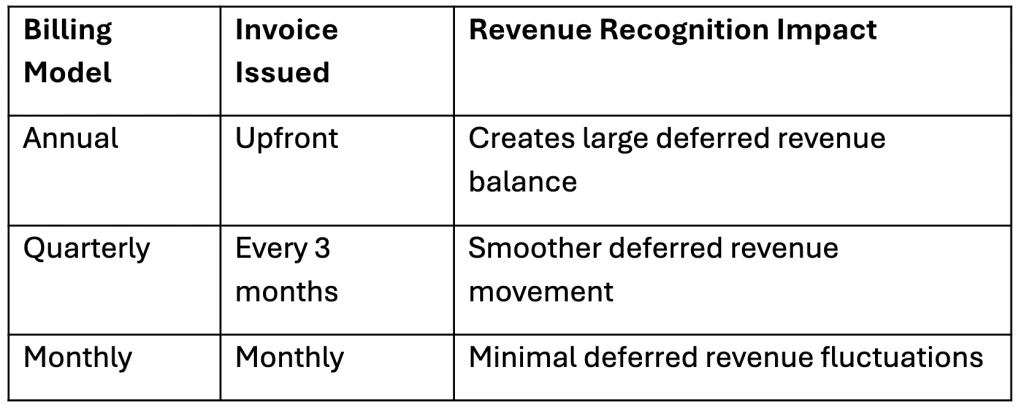 Billing frequency (monthly or annually) determines when it becomes invoice and revenue.