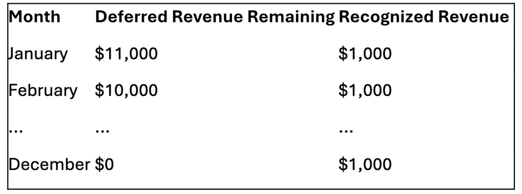 → The company recognizes $1,000 each month while $11,000 remains deferred.