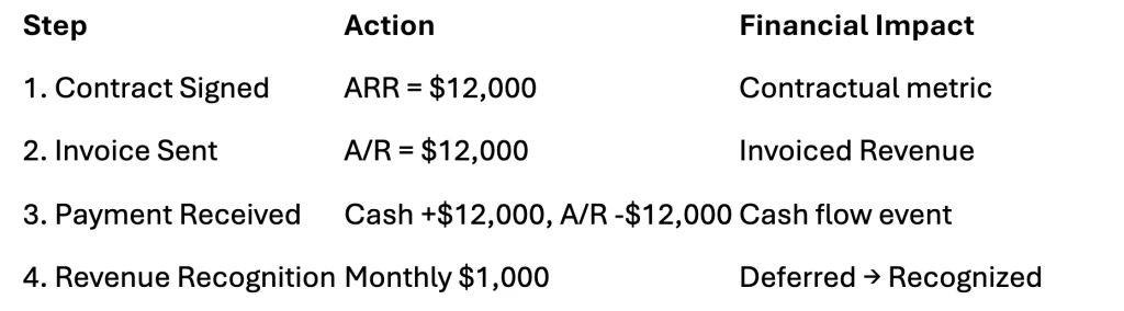 ARR → Invoice → Accounts Receivable → Cash → Deferred Revenue → Recognized Revenue