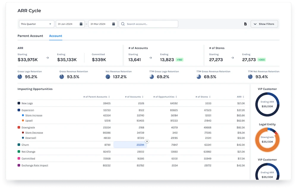 Accurate, consistent ARR calculations help improve investor and stakeholder confidence in a SaaS company’s financial position and growth trajectory. Easily export data in investor favored formats like the Customer Cube.